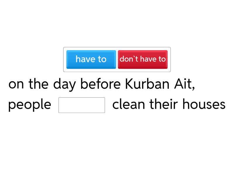 on the day before Kurban Ait, people ____ clean their houses i ____ get up early on Sunday we ____ cook. we can buy pizza you ____ bahave weel if you want a present kuat`s only.he ____ go to school