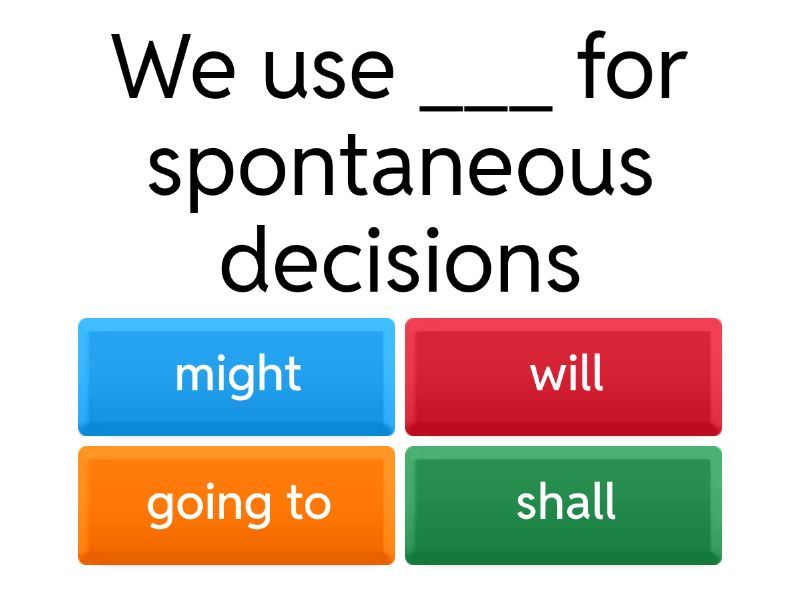 1) We use ___ for spontaneous decisions  a) might b) will c) going to d) shall 2) We use ___ for scheduled matters a) going to b) will c) -ing d) may 3) We use ___ for a fixed arragement a) will b) -ed c) might d) -ing 4) We use ____ for offers a) might b) -ed c) shall d) anybody