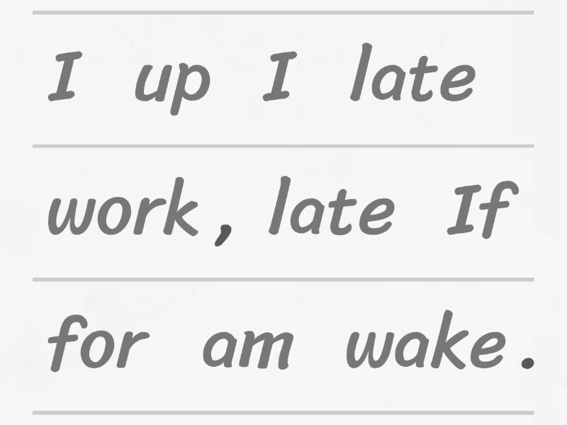If I wake up late, I am late for work., When my husband cooks, he burns the food., If Julie does not wear a hat, she gets sunstroke., If children don't eat well, they are not healthy., If Angela goes to bed early, she feels good the next day., If students submit all quizzes on time, they get half of their zapocet. ,