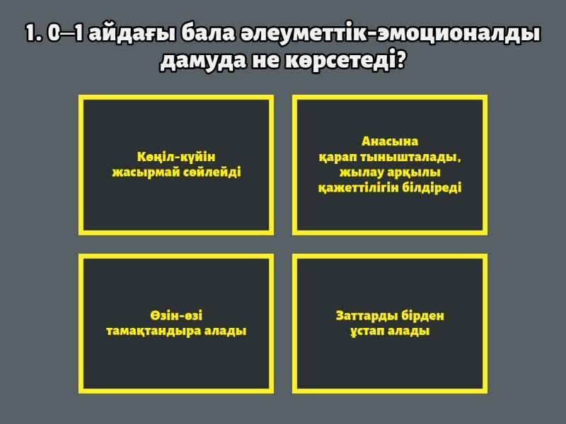 1) 1. 0–1 айдағы бала әлеуметтік-эмоционалды дамуда не көрсетеді? a) Көңіл-күйін жасырмай сөйлейді b) Анасына қарап тынышталады, жылау арқылы қажеттілігін білдіреді c) Өзін-өзі тамақтандыра алады d) Заттарды бірден ұстап алады 2) 8–9 айда когнитивті даму қандай әрекеттерді қамтиды? a) Заттарды біріктіру, қарапайым проблемаларды шешу b) Саусақтарын жұдырықтайды c) Тамақты өздігінен жеу d) Жүруге дайындық жоқ 3) Өзін-өзі күту дағдыларын дамыту не үшін керек? a) Тек музыкалық аспапты меңгеру b) Тек доп лақтыру c) Тамақтану, гигиена, киім-кешекке күтім жасау, дәретхана дағдыларын үйрету d) Тек ойын, тек сурет салу 4) Тактильді-қимылдық координацияны дамыту үшін балаға қандай әрекеттер ұсынылады? a) Қолыштарды ұстап, шығару b) Жұмыс үстелін жинау c) Бірнеше әрекетті тізбектеп жасау d) Көп сөздерді қайталау 5) Ойлау және есте сақтау қабілетін дамытуда бала не үйренеді? a) Бірнеше ойыншықты бірден алу b) Лепет дыбыстарын айту c) Саусақтарын жұдырықтай алу d) Заттарды есте сақтау, 1-2 қадам бойынша тапсырманы орындау 6) Сенсорлық қабылдауды дамытуда баланы жарыққа қарай басын бұруға үйрету қандай танымдық процесті қалыптастырады? a) Зейіннің ырықсыз түрін b) Есту талдауын c) Әлеуметтік рөлді модельдеу d) Қозғалыс координациясын 7) 6–7 айдағы бала сөйлеу қабілетін қалай дамытады? a) Тек жылап хабар береді b) Лепет жасайды, дыбысты қайталайды, кейбір сөз тәрізді дыбыстар шығарады c) 20 сөз айта алады d) Ешқандай дыбыс шығармайды 8) Бала қанша айда Заттарды форма мен көлеміне қарай ұстайды, екі қолын қатар қолданады a) 9-12 ай b) 8-9 ай c) 12-15 ай d) 3-4 ай 9) Дыбыс шыққанда реакция көрсету қандай қабілеттің дамуын білдіреді? a) Сөйлеу b) Ұсақ моторика c) Зейін d) Есту қабылдауы 10) Таныс адамның дауысын тану қай процестің дәлелі? a) Ұзақ мерзімді есту есі b) Тактильдік қабылдау c) Моторика d) Есту моторикасы