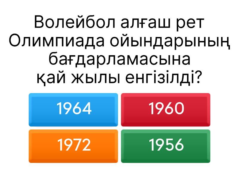 1) Волейбол алғаш рет Олимпиада ойындарының бағдарламасына қай жылы енгізілді? a) 1964 b) 1960 c) 1972 d) 1956 2) Қандай қала волейболды алғаш Олимпиадаға енгізген? a) Токио b) Париж c) Мехико d) Сеул 3) Жағажай волейболы Олимпиадада алғаш рет қашан ойналды? a) 1996 b) 1988 c) 2000 d) 1992