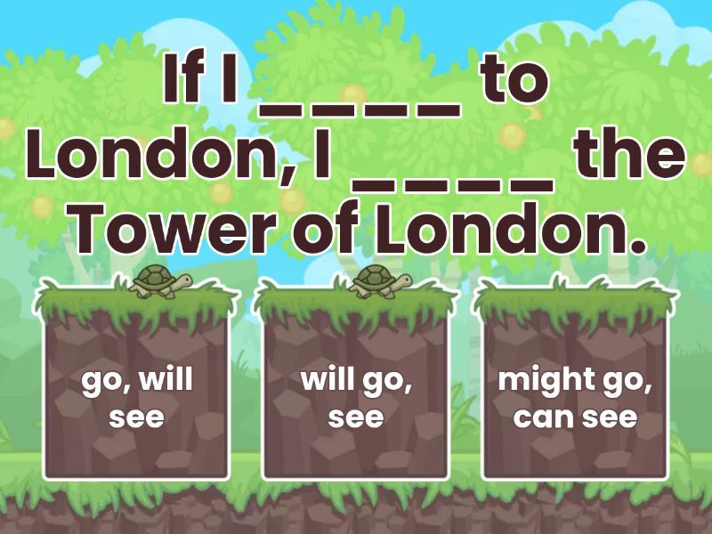 1) If I ____ to London, I ____ the Tower of London. a) go, will see b) will go, see c) might go, can see 2) If it____, I ____ to the park. a) will rain, won't go b) rain, don't go c) rains, won't go 3) She ____ the bus if she ____ soon. a) will miss, doesn't leave b) misses, won't leave c) will miss, don't leave 4) If I ____ today, I ____ to the party tonight. a) study, to go b) will study, will go c) study, will go 5) If you ____ that glass, it ____. a) will drop, breaks b) drop, breaks c) drop, will break 6) Your boss ____ angry if you ____ the job. a) will be, don't finish b) is, won't finish c) will be, finish 7) If you ____ lots of ice cream, you ____ a stomachache. a) eat, will have b) eat, had c) will eat, have 8) If she ____ to university, her parents ____ happy. a) won't go, won't be b) doesn't go, won't be c) not goes, aren't