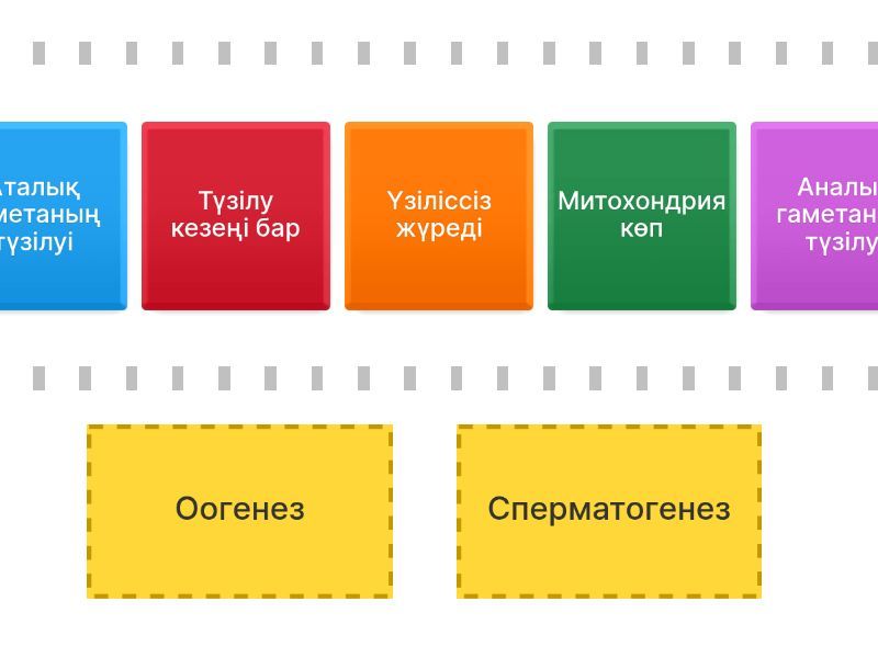 Оогенез: Аналық гаметаның түзілуі, Түзілу кезеңі жоқ, Өсу кезеңі ұзағырақ, Түзілу 28 күнге созылады, Жасушасы - ең ірі, Сперматогенез: Аталық гаметаның түзілуі, Түзілу кезеңі бар, Өсу кезеңі қысқа уақытты алады, Үзіліссіз жүреді, Митохондрия көп,