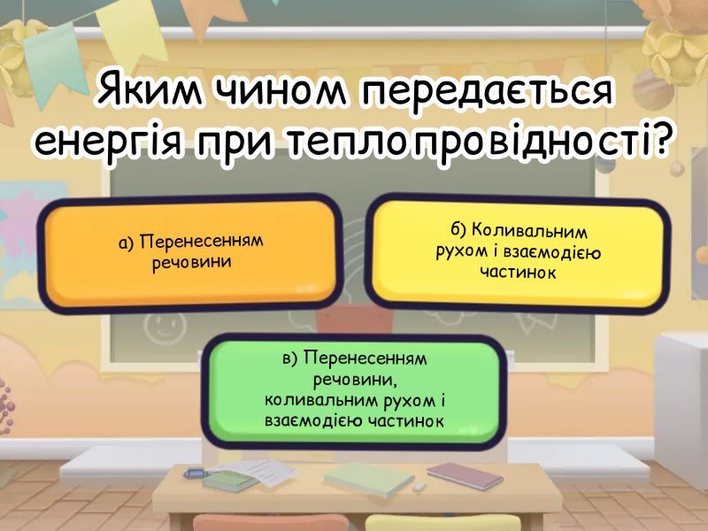 1) Яким чином передається енергія при теплопровідності? a) а) Перенесенням речовини b) б) Коливальним рухом і взаємодією частинок c) в) Перенесенням речовини, коливальним рухом і взаємодією частинок 2) Які тверді тіла мають найкращу теплопровідність? a) а) Пластмаса   b) б) Дерево c) в) Гума d) г) Метал 3) Низька теплопровідність газів пояснюється a) а) Малою рухливістю частинок b) б) Великими відстанями між частинками c) в) Малими розмірами частинок газу в порівнянні з частинками твердих тіл 4) Розташуйте речовини в порядку зростання їх теплопровідності: гума (1), срібло (2), повітря (3). a) а) 3,1,2   b) б) 1,2,3 c) в) 3,2,1 5) Нагріте повітря піднімається вгору, тому що зменшується ... повітря.  a) а) Маса   b) б) Вага c) в) Густина 6) Де вища температура повітря в приміщенні, яке обігрівається? a) а) Біля підлоги b) б) Під стелею c) в) Температура однакова у всьому об'ємі кімнати 7) У яких тілах може спостерігатися конвекція? a) а) В рідинах і газах b) б) В твердих тілах c) в) В рідинах, газах і сипучих тілах 8) Які існують види конвекції? a) а) Природна і примусова   b) б) Природна і вільна c) в) Тільки примусова d) г) Тільки вільна 9) У якому випадку відбувається примусова конвекція? a) а) Нагрівання приміщення електронагрівачем з вентилятором b) б) Нагрівання супу в каструлі c) в) Нагрівання північних районів Європи Гольфстрімом d) г) Утворення прохолодного вітру поблизу водойми 10) Природна конвекція не спостерігається a) а) На планетах з великою силою тяжіння b) б) На великих глибинах c) в) В умовах невагомості 11) Яким чином може здійснюватися теплопередача в рідинах? a) а) Конвекцією і теплопровідністю b) б) Тільки теплопровідністю c) в) Тільки конвекцією 12) Чому для виникнення конвекції в рідині її треба підігрівати знизу? a) а) Інакше рідина не прогріється b) б) Тому що, якщо нагрівати зверху, нагріті верхні шари рідини, як більш легкі, залишаться зверху c) в) Тому що підігрівати зверху незручно 13) Батарея опалення нагріла стілець який стоїть поруч. Яким чином в даному випадку передається енергія? a) а) Теплопровідністю   b) б) Конвекцією c) в) Випромінюванням 14) Які тіла випромінюють енергію? a) а) Гарячі   b) б) Теплі c) в) Холодні d) г) Всі тіла 15) Теплоприймач служить для a) а) Вимірювання температури b) б) Вимірювання об'єму газів c) в) Виявлення теплового випромінювання 16) Яка з поверхонь сильніше випромінює енергію, якщо їх температури однакові a) а) Біла b) б) Чорна c) в) Чорна і біла поверхні випромінюють енергію однаково 17) Дві зірки однакових розмірів мають різні температури поверхонь: 6000 °С і 15 000 °С. Яка з зірок випромінює більше енергії? a) а) Гарячіша b) б) Менш гаряча c) в) Зірки випромінюють однакову кількість енергії 18) Який сніг швидше тане: брудний або чистий? a) а) Чистий b) б) Брудний c) в) Чистий і брудний сніг тануть з однаковою швидкістю