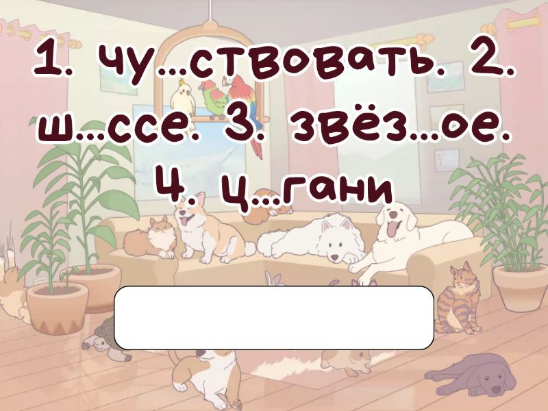 1. чу...ствовать. 2. ш...ссе. 3. звёз...ое. 4. ц...гани, 1. праз...ник. 2. ж...сткий. 3. со...нце. 4. ш...колад. 5. алмаз...ный, 1. амбиц...я. 2. уча...ствовать 3. крепос...ной. 4. любез...ный. 5. капус...ный. 6. ш...фёр .