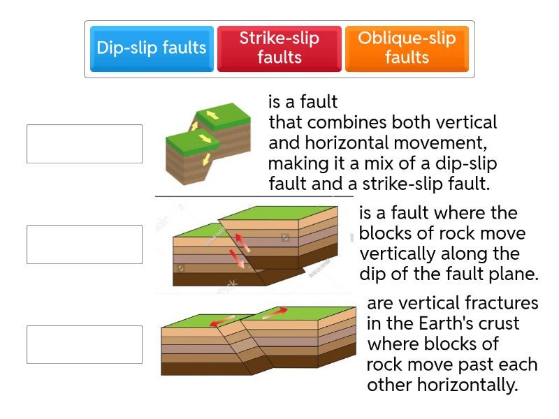 Dip-slip faults - is a fault where the blocks of rock move vertically along the dip of the fault plane., Strike-slip faults - are vertical fractures in the Earth's crust where blocks of rock move past each other horizontally., Oblique-slip faults - is a fault that combines both vertical and horizontal movement, making it a mix of a dip-slip fault and a strike-slip fault.,