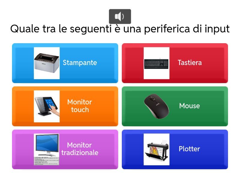 1) Quale tra le seguenti è una periferica di input a) Stampante b) Tastiera c) Monitor touch d) Mouse e) Monitor tradizionale f) Plotter 2) Quale tra le seguenti è una periferica di output a) Stampante b) Tastiera c) Monitor touch d) Mouse e) Monitor tradizionale f) Plotter