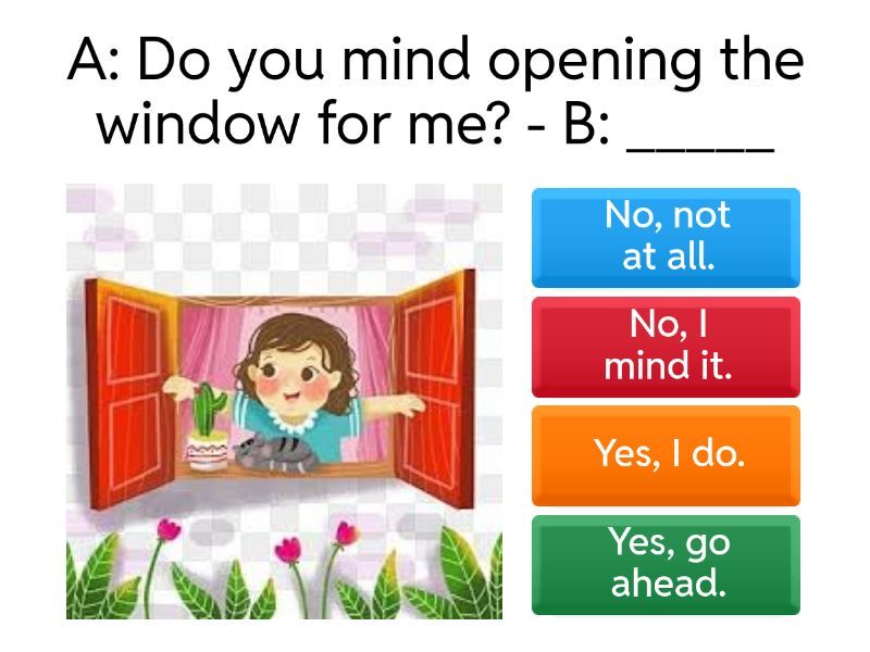 1) A: Do you mind opening the window for me? - B: _____ a) No, not at all. b) No, I mind it. c) Yes, I do. d) Yes, go ahead. 2) A: Could you show me the way to the bus stop, please? - B: _____ a) No, I couldn’t. b) Yes, I could. c) Sure. It’s over there.  d) I know where it is. 3) A: Could you please show me how to use this washing machine? - B: _____ a) Yes, I could. Just turn on the fan.                                      B. Sure. Just press this green button. b) Sure. Just press this green button. c) No, I couldn’t wash these clothes.                                     D. No, I don’t have a washing machine. d) No, I don’t have a washing machine. 4) A: Would you mind telling me something about Dong Ba Market? - B: _____ a) Yes, I would. It’s a big market in Hue. b) Yes, I can buy a lot of things there. c) No, I wouldn’t. You can ask another person. d) Not at all. It’s the largest commercial centre in Hue. 5) A: Could you give me a hand with these rubbish bins? a) Certainly. Where do you want to put them?    b) Sure. I don’t like them much. c) No, I couldn’t. They’re over there. d) Yes, I could give you the bins.