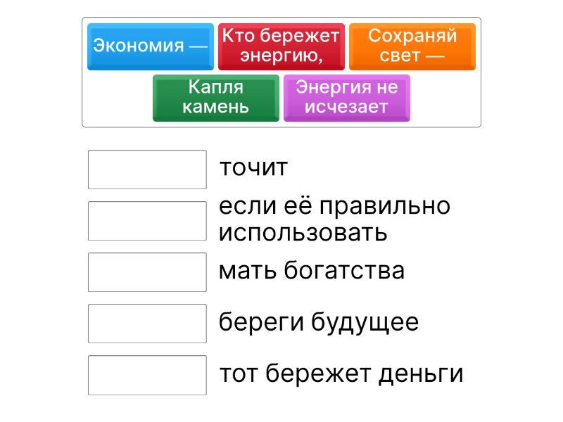 Кто бережет энергию, - тот бережет деньги, Экономия — - мать богатства, Сохраняй свет — - береги будущее, Капля камень - точит, Энергия не исчезает - если её правильно использовать,