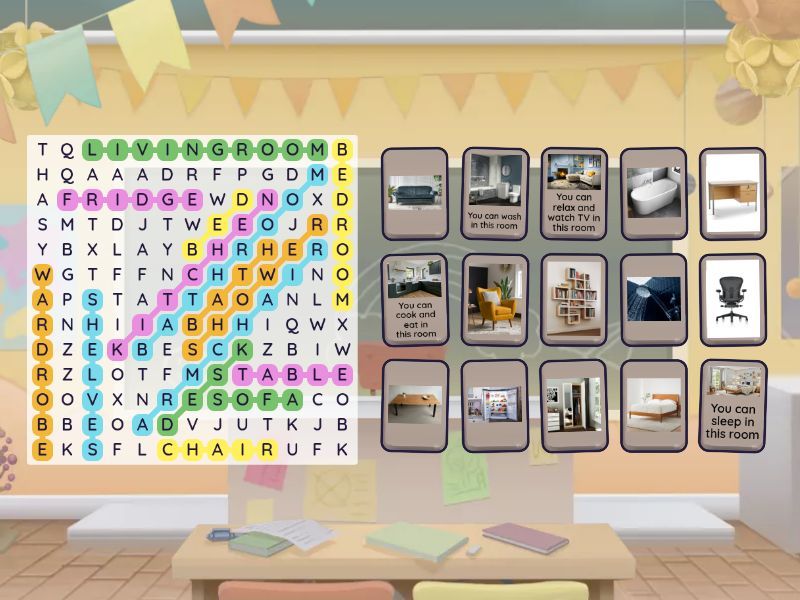 bath, chair, desk, armchair, fridge, shower, bed, sofa, shelves, table, wardrobe, bedroom - You can sleep in this room, living room - You can relax and watch TV in this room, bathroom - You can wash in this room, kitchen - You can cook and eat in this room,