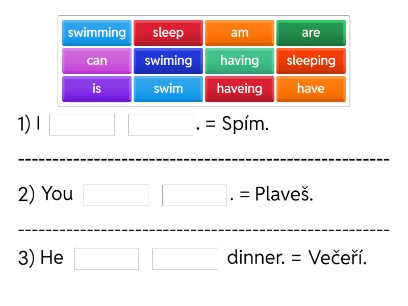 1) I ____ ____. = Spím. ------------------------------------------------------ 2) You ____ ____. = Plaveš. ------------------------------------------------------ 3) He ____ ____ dinner. = Večeří. 1) We ____ ____ out. = Jdeme ven. ------------------------------------------------------ 2) She ____ ____. = Tančí. ------------------------------------------------------ 3) I ____ ____ ____ music. = Poslouchám hudbu. 1) I ____ ____ ____. = Nestuduju. ------------------------------------------------------ 2) She ____ ____ her homework. = Nedělá si úkoly. ------------------------------------------------------ 3) We ____ ____ to work. = Nejdeme do práce 1) We ____ ____. = Nevaříme. ------------------------------------------------------ 2) She ________. = Nesedí. ------------------------------------------------------ 3) ____ ____ ____ a rest. = Neodpočívám. 1) ____ ____ ____? = Spíš? ------------------------------------------------------ 2) ____ ____ ____? = Vaří? 1) ____ ____ ____? = Tančí? ------------------------------------------------------ 2) ____ ____ ____? = Peče?