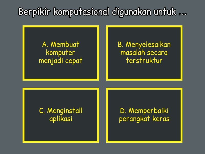1) Berpikir komputasional digunakan untuk … a) A. Membuat komputer menjadi cepat b) B. Menyelesaikan masalah secara terstruktur c) C. Menginstall aplikasi d) D. Memperbaiki perangkat keras 2) Pola tertentu yang sering berulang dalam suatu masalah disebut … a) A. Pola (pattern) b) B. Debugging c) C. Abstraksi d) D. Flowchart