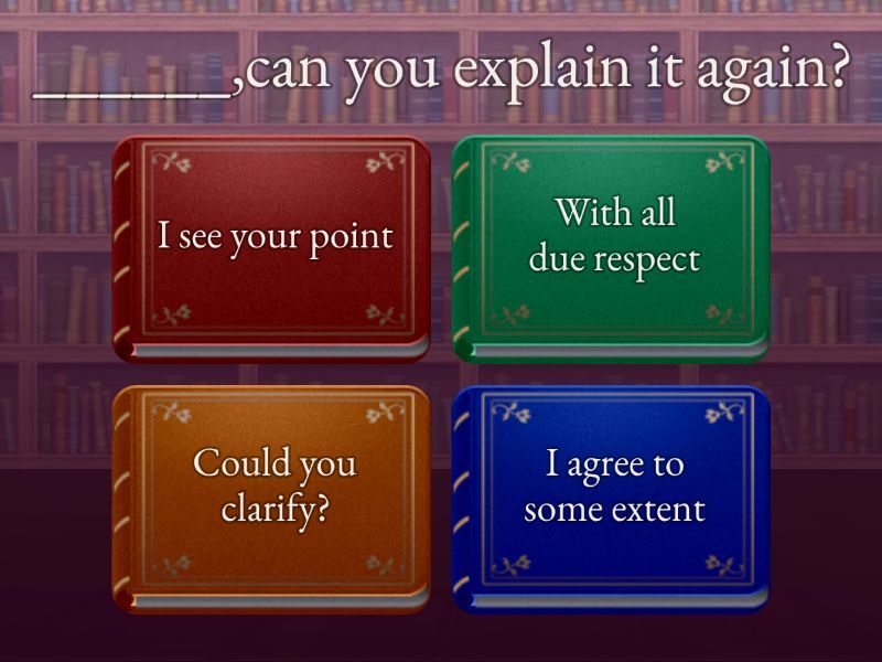 1) ______,can you explain it again? a) I see your point b) With all due respect c) Could you clarify? d) I agree to some extent 2) ______,but I have a different view a) I agree to some extent b) Could you clarify? c) I’m afraid I disagree d) With all due respect 3) ________but I think there is another option a) I’m afraid I disagree b) With all due respect c) I agree to some extent d) I see your point 4) _______,but we should consider another option a) I’m afraid I disagree b) Could you clarify? c) I agree to some extent d) With all due respect 5) ______,that might not be possible right  now a) I agree to some extent b) I see your point c) With all due respect d) Could you clarify?