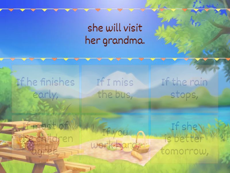 If she is better tomorrow, - she will visit her grandma., If the rain stops, - we'll be able to go for a walk., If he finishes early, - he will go home., If I miss the bus, - I won't be here on time., If you work hard,   - you will get good results., If most of the children agree, - they will have a barbecue next Saturday.,