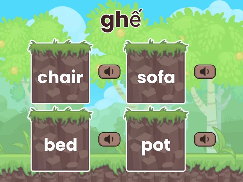 1) ghế a) chair b) sofa c) bed d) pot 2) bàn coffee a) plate b) coffee table c) stove d) bowl 3) ghế sofa a) pot b) pan c) sofa d) plate 4) tủi kéo a) dresser b) glass c) bed d) rug 5) thảm a) sink b) refrigerator c) silverware d) rug 6) giường a) toilet b) bed c) plate d) spoon 7) đèn ngủ a) cup b) restroom c) lamp d) knife 8) bồn tắm  a) bathtub b) sofa c) silverware d) restroom 9) phòng tắm a) shower b) restroom c) pot d) pan 10) nhà vệ sinh a) plate b) toilet c) bed d) cabinet 11) phòng vệ sinh a) microwave b) fork c) restroom d) sink 12) lò vi sóng a) microwave b) lamp c) dresser d) coffee table 13) tủ chén a) dresser b) cabinet c) fork d) refrigerator 14) bồn a) sink b) rug c) bathtub d) cup 15) lò a) stove b) pot c) spoon d) toilet 16) tủ lạnh a) cup b) fork c) refrigerator d) lamp 17) nồi a) cabinet b) pot c) chair d) restroom 18) chảo a) pan b) microwave c) plate d) silverware 19) ly a) fork b) plate c) bowl d) cup 20) tô a) bowl b) lamp c) sofa d) rug 21) dao a) plate b) fork c) knife d) silverware 22) bộ dao nĩa a) pot b) sink c) silverware d) knife 23) muỗn a) sofa b) coffee table c) shower d) spoon 24) dĩa a) plate b) spoon c) fork d) dresser 25) nĩa a) shower b) bed c) fork d) sofa 26) ly thủy tinh a) dresser b) glass c) pan d) bathtub