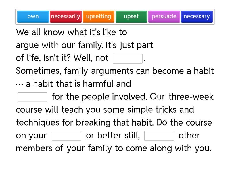 We all know what it's like to argue with our family. It's just part of life, isn't it? Well, not ____. Sometimes, family arguments can become a habit … a habit that is harmful and ____ for the people involved. Our three-week course will teach you some simple tricks and techniques for breaking that habit. Do the course on your ____ or better still, ____ other members of your family to come along with you. When I was younger, I had a lot of ____ with my parents … and with my sister too. I won a few of them, but mostly I lost. Then I ____ what I was doing wrong: I wasn't preparing for the arguments. So I started ____ them more like exams. I actually started ____ for my family arguments! I prepared all my ____, my examples. You really should take the same ____ — it works like magic! Now I hardly ever ____ an argument at home. I left home when I was seventeen after an argument with my parents, and to be ____, it was the best thing that happened to me. I had to grow up quickly! At nineteen, I ____ my own business. Now I live in a £5-million house in London and run a business with more than a thousand ____. That family argument gave me the ____ I needed. Of course, I've got a lot of talent too!