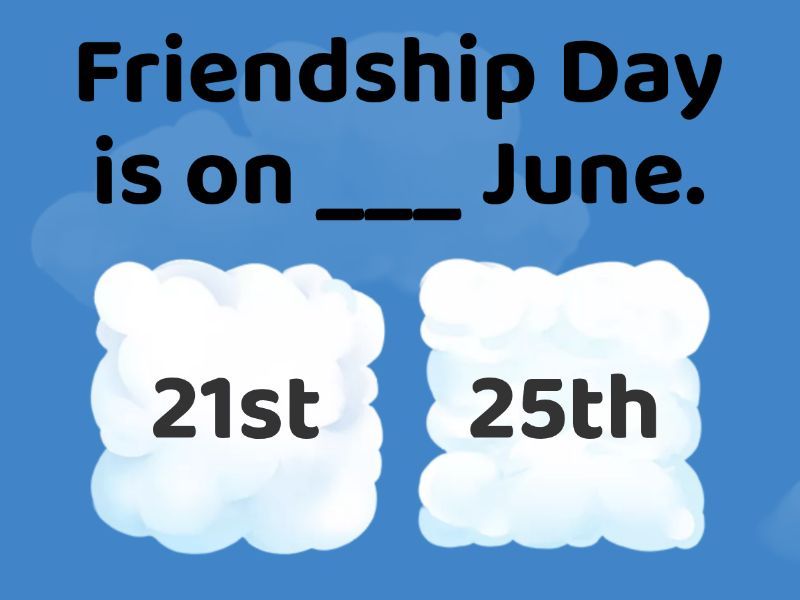 1) Friendship Day is on ___ June. a) 21st b) 25th 2) People spend the day with their ___ . a) Family b) friends 3) Children make friendship ___ . a) drawings b) bracelets 4) In the afternoon people dance in ___ . a) parks b) schools 5) If a best friend lives in another country, they send a ___ . a) card b) gift