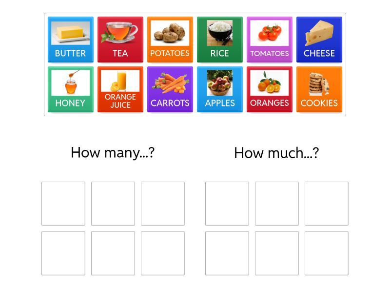How many...?: COOKIES, TOMATOES, ORANGES, CARROTS, POTATOES, APPLES, How much...?: TEA, RICE, CHEESE, BUTTER, HONEY, ORANGE JUICE,