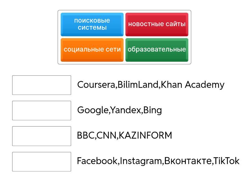 новостные сайты - BBC,CNN,KAZINFORM, образовательные - Coursera,BilimLand,Khan Academy, социальные сети - Facebook,Instagram,Вконтакте,TikTok, поисковые системы - Google,Yandex,Bing,