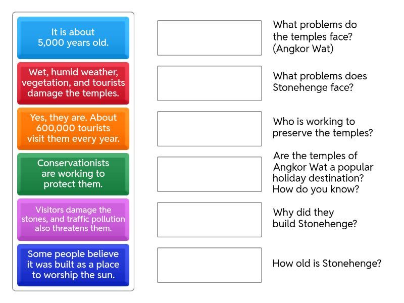 It is about 5,000 years old. - How old is Stonehenge?, Some people believe it was built as a place to worship the sun. - Why did they build Stonehenge?, Visitors damage the stones, and traffic pollution also threatens them. - What problems does Stonehenge face?, Wet, humid weather, vegetation, and tourists damage the temples. -  What problems do the temples face? (Angkor Wat), Yes, they are. About 600,000 tourists visit them every year. - Are the temples of Angkor Wat a popular holiday destination? How do you know?, Conservationists are working to protect them. - Who is working to preserve the temples?,