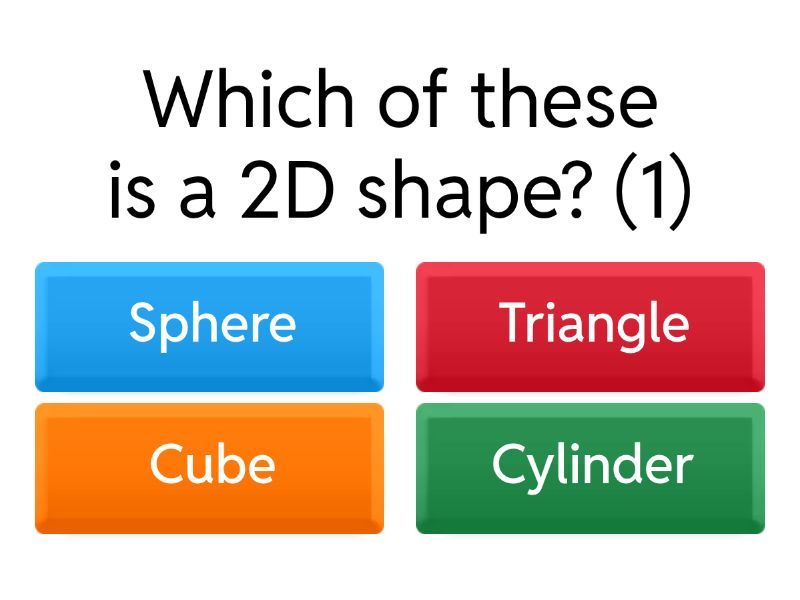 1) Which of these is a 2D shape? (1) a) Sphere b) Triangle c) Cube d) Cylinder 2) How many faces does a cube have? (1) a) 2 b) 4 c) 6 d) 8 3) Which 3D shape has only one curved surface? (1) a) Cone b) Sphere c) Cylinder d) Cube 4) Identify the shape: It has 4 triangular faces and a square base. (1) a) Sphere  b) Pyramid c) Cube d) Triangle  5) A rectangle is a type of (1) a) Line b) Curve c) B) 3D shape d) 2D shape 6) Which 3D shape has 2 circular faces and 1 curved surface? (1) a) Sphere b) Prisma c) Cone d) Cylinder 7) How many edges does a triangular prism have? (1) a) 7 b) 6 c) 8 d) 9 8) Which of these 2D shapes has exactly 6 sides? (1) a) Prisma b) Pentagon c) Hexagon d) Octagon 9) A circle rolled along a flat surface will make which 3D shape? (1) a) Cube b) Cylinder c) Sphere d) Cone 10) Which real-life object is closest in shape to a cone? (1) a) Ice-cream cone b) A) Ball c) B) Box d) C) Can