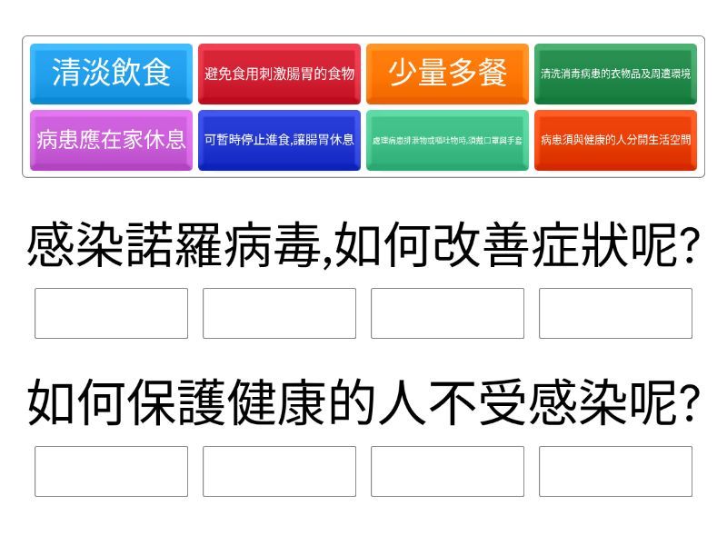 感染諾羅病毒,如何改善症狀呢?: 可暫時停止進食,讓腸胃休息, 少量多餐, 清淡飲食, 避免食用刺激腸胃的食物, 如何保護健康的人不受感染呢?: 處理病患排泄物或嘔吐物時,須戴口罩與手套, 病患應在家休息, 病患須與健康的人分開生活空間, 清洗消毒病患的衣物品及周遭環境,