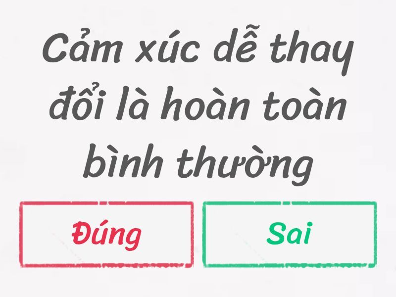 1) Cảm xúc dễ thay đổi là hoàn toàn bình thường a) Đúng b) Sai 2) Tập thể thao và ngủ đủ giấc giúp phát triển chiều cao a) Đúng b) Sai 3) Không ăn sáng giúp cơ thể thon gọn hơn khi dậy thì a) Đúng b) Sai 4) Có quyền nói “không” khi bị động chạm làm mình khó chịu a) Đúng b) Sai 5) Ai dậy thì muộn là “khác thường” a) Đúng b) Sai 6) Mỗi người dậy thì theo tốc độ khác nhau a) Đúng b) Sai 7) Dậy thì chỉ ảnh hưởng đến cơ thể chứ không ảnh hưởng đến cảm xúc a) Đúng b) Sai