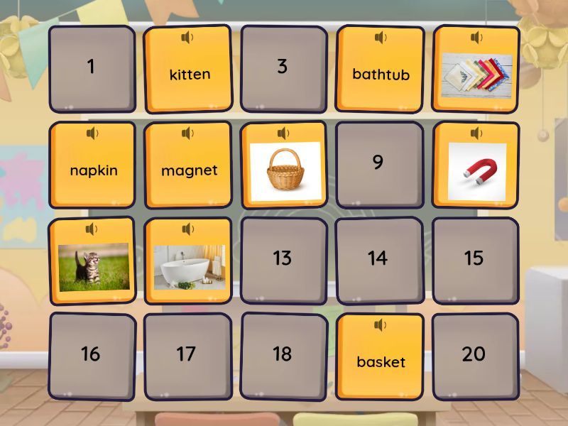 bathtub, magnet, kitten, napkin, basket, invite, athlete, cupcake, trombone, rosebud,