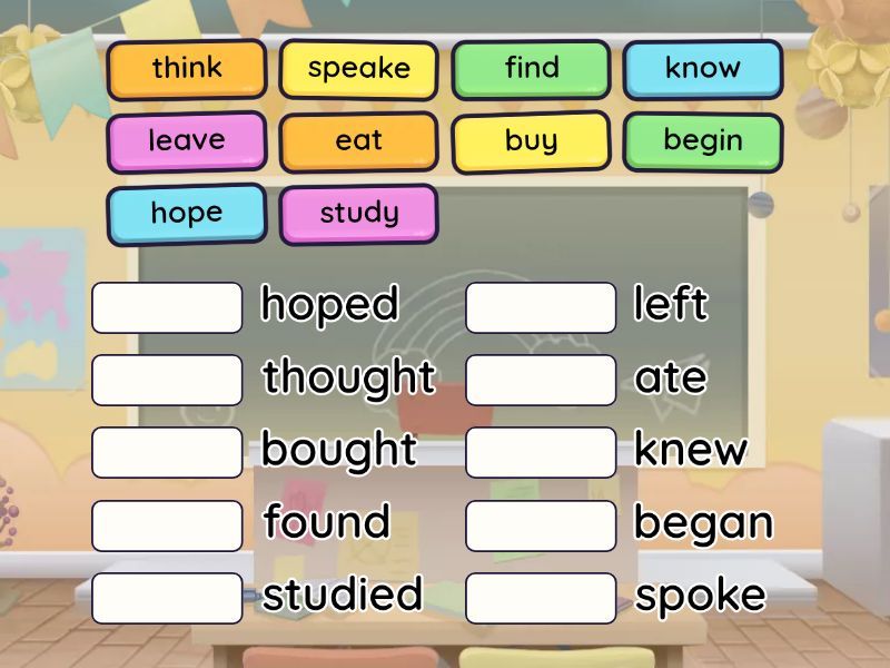 begin - began, eat - ate, study - studied, think - thought, speake - spoke, buy - bought, hope - hoped, find - found, know - knew, leave - left,