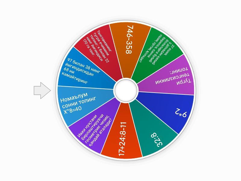1) 97 билан 38 нинг йигиндисидан 68 ни камайтиринг a) 65 b) 68 c) 67 d) 66 2) Тенгламанинг тугри ечимини топинг: х билан 22 нинг йиғиндиси 170 га тенг. a) 150 b) 147 c) 192 d) 148 3) 746-358 a) 388 b) 376 c) 380 d) 387 4) 37 ошиқ 5 донадан қилиб болаларга булиб берилса, қанча ошиқ ортиқ қолади? a) 7(4ошиқ) b) 7(2ошиқ) c) 7(1ошиқ) d) 7(3ошиқ) 5) Тугри тенгсизликни топинг: a) 100*>*1 b) 720+20>52+20 c) 15+20=100-60 d) 27+39>3*20 6) 9*2 a) 11 b) 17 c) 18 d) 16 7) 32:8 a) 3 b) 4 c) 6 d) 5 8) 17+24:8-11 a) 7 b) 8 c) 5 d) 9 9) Икки нуқтани бирлаштирувчи геометрик чизиқ қандай аталади? a) чизиқ b) бурчак c) кесма d) нур 10) Номаълум сонни топинг Х*8=40 a) 4 b) 5 c) 7 d) 6