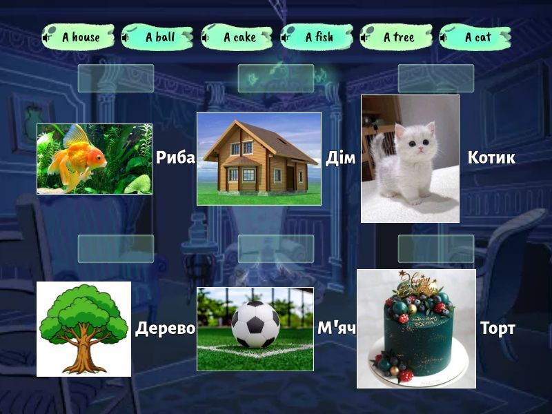 A cat - Котик, A dog - Песик, Sun - Сонце, A ball - М'яч, A book - Книга, A house - Дім, A fish - Риба, A cake - Торт, A toy - Іграшка, A tree - Дерево, A star - Зірка, A bird - Пташка,