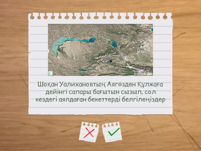 Шоқан Уалихановтың Аягөзден Құлжаға дейінгі сапары бағытын сызып, сол кездегі аялдаған бекеттерді белгілеңіздер,