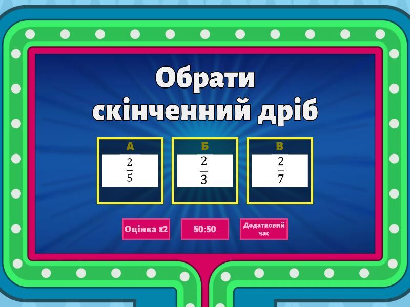 1) Обрати скінченний дріб a) b) c) 2) Обрати нескінченний періодичний дріб a) b) c) 3) Обрати скінченний дріб a) b) c) 4) Обрати нескінченний періодичний дріб a) b) c) 5) Обрати скінченний дріб a) b) c) 6) Обрати нескінченний періодичний дріб a) b) c)