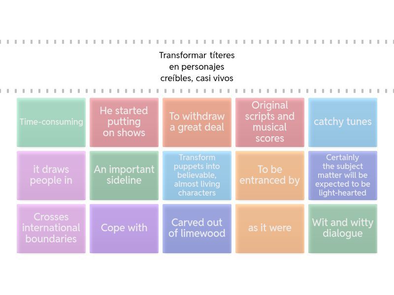 Transform puppets into believable, almost living characters - Transformar títeres en personajes creíbles, casi vivos, Original scripts and musical scores - Guiones originales y partituras musicales, To be entranced by - Quedar embelesado/encantado por, Wit and witty dialogue - Ingenio y diálogo ingenioso, Crosses international boundaries - Traspasa fronteras internacionales, Carved out of limewood - Tallado en madera de tilo, Time-consuming - Consume mucho tiempo, To withdraw a great deal - Retirar/sacar una gran cantidad, Cope with - Hacer frente a (Lidar con), catchy tunes - melodías pegadizas, He started putting on shows - Él empezó a dar espectáculos, as it were - Por así decirlo, An important sideline - Una fuente de ingresos adicional importante, it draws people in - Atrae a la gente, Certainly the subject matter will be expected to be light-hearted - Ciertamente se esperará que el tema sea alegre,