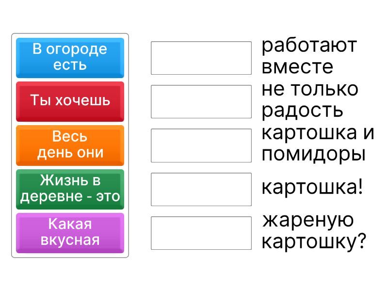 Жизнь в деревне - это - не только радость, Каждый день мать - много работает, В саду есть - яблоки, груши и персики, В огороде есть - картошка и помидоры, Корова даёт - вкусное молоко, Мать уже пожилая, - а сын молодой и ленивый, Ленивый сын говорит, что - жареная картошка противная, Мать недовольна, но - ничего не говорит, Сын оставляет - картошку на столе, Мать моет - посуду и идёт спать, Мать будит сына - очень рано, Весь день они - работают вместе, День - очень жаркий, Мать и сын не отдыхают - ни минуты, Сначала они работают в огороде, - а потом в саду, Что сегодня - ни ужин?, Ты хочешь - жареную картошку?, Это самое - быстрое блюдо, Когда картошка готова, - сын её быстро ест, Какая вкусная - картошка!,