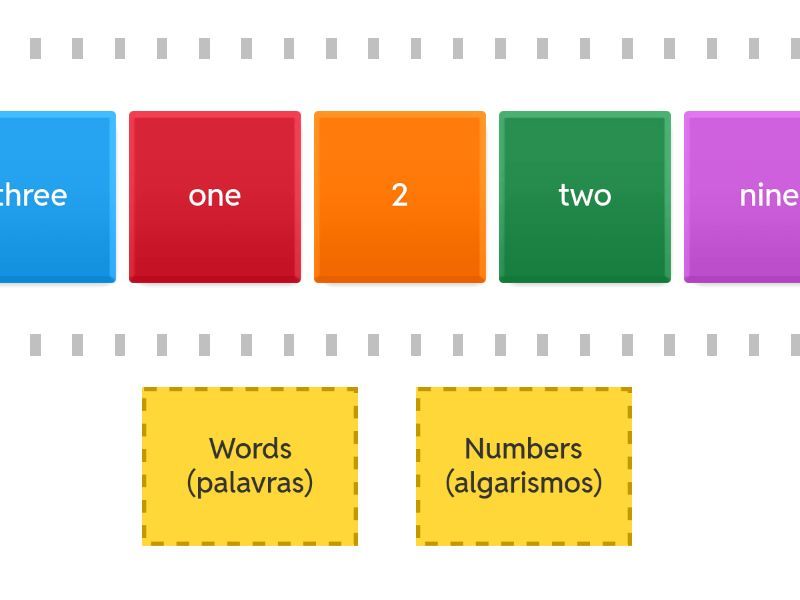 Words (palavras): one  , two  , three  , four  , five  , six  , seven  , eight  , nine  , ten, Numbers (algarismos): 1  , 2  , 3  , 4  , 5  , 6  , 7  , 8  , 9  , 10,
