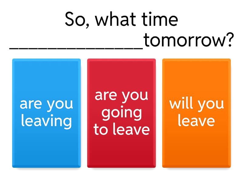 1) So, what time ______________tomorrow? a) are you leaving b) are you going to leave c) will you leave 2) Look! That car over there _______________ ! a) is crashing b) is going to crash c) will crash 3) I ______________ with you tonight. I've got a lot of homework to do. a) 'm not going to come b) 'm not coming c) won't come 4) You look tired. Sit down, I _________ you some chamomile tea. a) 'm going to make b) make c) 'll make d) 'm making 5) The classes __________ at 4pm, but some students arrive at 5pm. a) starts b) start c) are going to start d) will start 6) A: It's really hot in here. B: ________ the windows and the door. a) I'll open b) You'll open c) I'm opening d) You're going to open 7) The film _________ at 7pm, so I don't think we ________on time. a) finishes - 'll arrive b) is finishing - aren't going to arrive c) is going to finish - aren't arriving 8) Do you think William ________if I use his computer? a) is going to mind b) will mind c) is minding d) minds 9) The library ________ at half past eight on Saturdays. a) is going to close b) closes c) close d) will close 10) There are dark clouds, so it ________________. a) will rain b) is raining c) rains d) is going to rain 11) What's wrong? You look as if you ___________. a) 're going to cry b) 'r crying c) will cry d) cry 12) I _____________ to Argentina to see my boyfriend next month. I've already bought the tickets. a) 'm going to travel b) 'm travelling c) 'll travel d) travel 13) The exam ________ on the 25th Septembre, so please study. a) will take place b) is taking place c) takes place d) 's going to take place 14) Hurry up! The plane ________ in 30 min! I don't think we _______ it. a) is taking off - arrive b) will take off - 'll arrive c) takes off - 'll arrive d) is going to take off - 're arriving 15) Teacher, please give another chance! I ______ hard this time :( a) 'll study b) 'm going to study c) 'm studying d) study 16) What ____________ for the weekend? a) are you doing b) do you do c) will you do 17) A: He ________to her, look at the box ring! B: _____she _____yes? a) 's proposing - does - say b) 'll propose - will - say c) 's going to propose - will - say d) proposes - is going to - say 18) A: Do you think we_________ this cycle? B: I'm pretty sure we ______. a) 'll pass - will b) 're going to pass - will c) 're passing - 're going d) pass - do 19) The fortune teller told me that I __________ the lotto this year, so I ________ some tickets to Hawai. a) 'm going to win - 'm buying b) 'll win - 'm buying c) 'll win - 'm going to buy d) win - buy