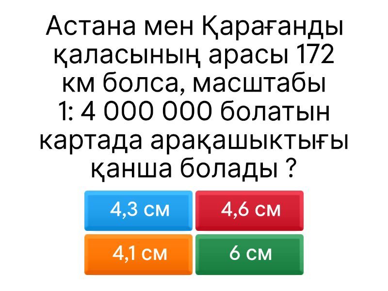 1) Астана мен Қарағанды қаласының арасы 172 км болса, масштабы 1: 4 000 000 болатын картада арақашыктығы қанша болады ? a) 4,3 см b) 4,6 см c) 4,1 см d) 6 см 2) Егер туристер тәулігіне 30 км/сағ жаяу жүретін болса, онда Казақстан Республикасының батысынан шығысқа қарай қанша күн жүреді ? a) 20 күн b) 100 күн c) 45 күн d) 85 күн 3) Сынып бөлмесінің ұзындығы 8 м, ені 5 м, биіктігі 3 м болса, осы бөлмедегі ауаның салмағы қанша болады ? a) 160 кг b) 165 кг c) 150 кг d) 170 кг 4) Жер бетінде атм. қысым 750 мм с.б. болса, 5000 м биіктікте ұшып бара жатқан ұшақ бортының сыртында қандай атмосфералық қысым болады ? a) 360 мм b) 760 мм c) 450 мм d) 250 мм 5) Жер бетінде ауа температурасы +200 С болса, 3000 м биіктіктегі температура қанша болады ? a) +20 С b) +150С c) 200С d) +200С 6) Егер барометр төбенің табанында 762 мм с.б., ал төбенің басында 757 мм көрсетіп тұрса, онда төбенің биіктігі қанша ? a) 50 м b) 55 м c) 53 м d) 58 м 7) Петропавл қаласында буланушылық мөлшері 500 мм, жауын-шашын 500 мм болса, ылғалдану коэффициенті қаншаға тең болады ? a) 0,3 b) 0,001 c) 1 d) 0,02 8) Жер шары шеңберінің 10 доғасының қанша километр екенін анықтаңыз? a) 111 км b) 40 000км c) 360 км d) 150км 9) Бір тәулік ішінде ауа температурасы төмендегідей болып өзгерді: +40С, -20С,+80С,+60 С. Тәуліктің орташа температурасын тап ? a) 40С b) 6 0С c) 50C d) 70C