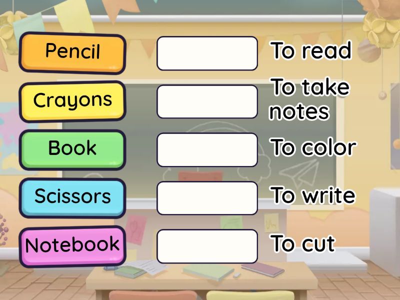 Pencil - To write, Scissors - To cut, Book - To read, Crayons - To color, Notebook - To take notes,