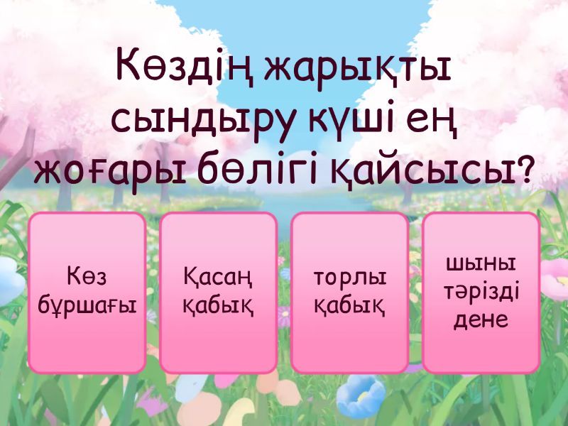 1) Көздің жарықты сындыру күші ең жоғары бөлігі қайсысы? a) Көз бұршағы b) Қасаң қабық c) торлы қабық d) шыны тәрізді дене 2) Торлы қабықтағы жарық сезгіш рецепторлар қалай аталады? a) Ауырсыну рецепторлары b) Сорғыш жасушалар c) Сағақ (таяқша) және сауытша d) Эпителий жасушалары 3) Құрғақ көз синдромының негізгі себебі: a) Көзге бөгде зат түсуі b) Жас бөлінуінің жеткіліксіздігі c) Бұршақтың бұлдырлануы d) Бактериалды қабыну 4) Катаракта дегеніміз: a) Торлы қабықтың қабынуы b) Көз бұршағының бұлдырлануы c) Көз қысымының жоғарылауы d) Қасаң қабықтың жарақаты 5) Глаукоманың ең қауіпті белгісі: a) Көздің қызаруы b) Жас ағу c) Ішкі көз қысымының жоғарылауы d) Қасаң қабықтың жаралануы 6) Конъюнктивит кезінде зақымданатын құрылым: a) Қасаң қабық b) Көз бұршағы c) Көздің сыртқы шырышты қабығы d) Торлы қабық 7) Миопия (жақыннан көру) кезінде сурет қайда фокусталады? a) Торлы қабықтың алдына b) Торлы қабықтың артына c) Дәл торлы қабыққа d) Склераға 8) Гиперметропияның (алыстан көру) негізгі себебі: a) Көз алмасының ұзарып кетуі b) Көз алмасының қысқа болуы c) Қасаң қабық қалыңдауы d) Бұршақтың пішіні өзгеруі 9) Көз бұлшықеттерінің қызметі: a) Жас өндіру b) Көздің қозғалысын қамтамасыз ету c) Көру жүйкесін қорғау d) Көз қысымын реттеу 10) Астрохламиялық (аллергиялық) конъюнктивиттің негізгі белгісі: a) Көздің іріңдеуі b) Қышу c) Көрудің толық жоғалуы d) Бұршақтың күңгірттенуі