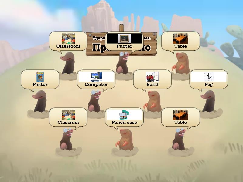 Правильно: Classroom, Table, Computer, Peg, Pencil case , Board, Poster, Picture, Drawers, Cupboard, CD player , Неправильно: Pucter, Paster, Borld, Classrum, Teble, Pig, Canputer, Capboard, Pancils, Cdplyer, Boarld,