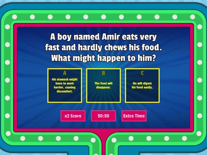 1) A boy named Amir eats very fast and hardly chews his food. What might happen to him? a) He will digest his food easily. b) The food will disappear. c) His stomach might have to work harder, causing discomfort. 2) Sara forgot to bring her water bottle to school and didn’t drink water the whole day. How might this affect her digestive system? a) It may be harder for her body to absorb water and move waste. b) It will make her run faster. c) Her digestive system will stop working. 3) You need a snack before class. Which is better for your digestive system? a) An apple b) A handful of candies c) Both are the same 4) After chewing his apple, Lucas swallows it. The food moves down a long tube to his stomach. Which part of the digestive system does the food travel through? a) Small intestine b) Gullet 5) In the stomach, Sarah’s food is mashed and mixed with juices. What is the function of the stomach? a) To mix and break down food b) To release waste c) To chew food d) To absorb nutrients