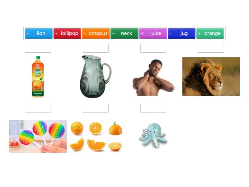 jug, juice, kangaroo, key, lion, lollipop, man, mango, nose, neck, orange, octopus, panda, pen,