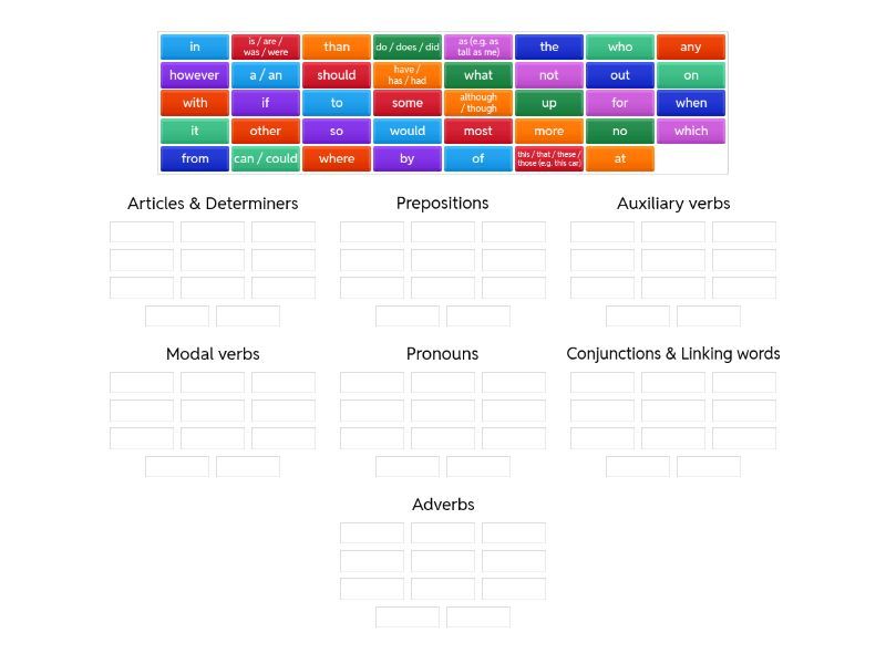 Articles & Determiners: other, the, a / an, no, some, any, more, most, this / that / these / those (e.g. this car), Prepositions: of, in, to, for, on, with, at, by, from, up, out, Auxiliary verbs: is / are / was / were, have / has / had, do / does / did, Modal verbs: can / could, would, should, Pronouns: it, which, who, what, when, where, Conjunctions & Linking words: if, than, although / though, however, so, Adverbs: not, as (e.g. as tall as me),