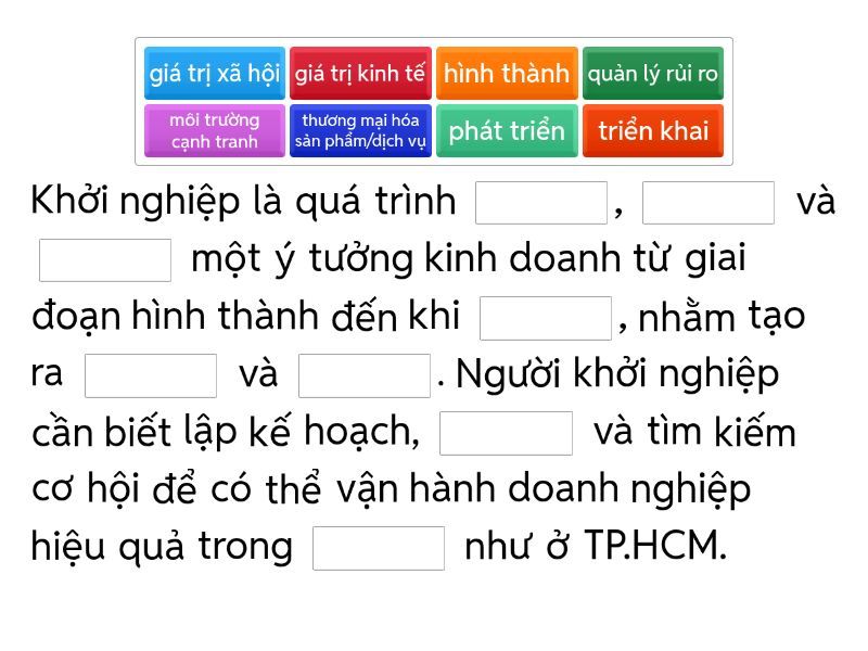 Khởi nghiệp là quá trình ____, ____ và ____ một ý tưởng kinh doanh từ giai đoạn hình thành đến khi ____, nhằm tạo ra ____ và ____. Người khởi nghiệp cần biết lập kế hoạch, ____ và tìm kiếm cơ hội để có thể vận hành doanh nghiệp hiệu quả trong ____ như ở TP.HCM. TP.HCM là môi trường thuận lợi cho khởi nghiệp nhờ ____, hệ sinh thái khởi nghiệp phát triển, cơ sở hạ tầng hiện đại và chính sách hỗ trợ doanh nghiệp. Start-up còn có cơ hội kết nối với nhà đầu tư, ____ và tiếp cận thị trường lớn để phát triển doanh nghiệp bền vững. Đặc điểm của khởi nghiệp là ____ để tạo ra những ____ hoặc cung ứngnhững ____ của mình nhưng những sản phẩm, dịch vụ này có thể ____ những vấn đề cụ thể, nhu cầu cụ thể trên thị trường một cách đột phá ở thời điểm hiện tại Thành phố Hồ Chí Minh là đầu tàu của ____, là trung tâm____, ____, ____ của cả nước. Chính vì vậy, nơi đây đã mang lại nhiều ____ để các cá nhân, tập thể khởi nghiệp và ____. Để công ty phát triển, việc lập ____ là rất quan trọng. Ngân sách này sẽ bao gồm các khoản ____ như marketing, tiền lương nhân viên và các chi phí mua sắm khác. Tuy nhiên, không được ____ để tiết kiệm tối đa ngân sách, đồng thời vẫn đảm bảo có đủ vốn khi ____ Trong quá trình thực hiện, cần phải ____ và ____ mức độ hoàn thành mục tiêu để ____ bản kế hoạch. Đồng thời, ____ phản hồi từ khách hàng về ____ mẫu và thực hiện những ____ kịp thời, trước khi sản phẩm ra mắt chính thức trên thị trường