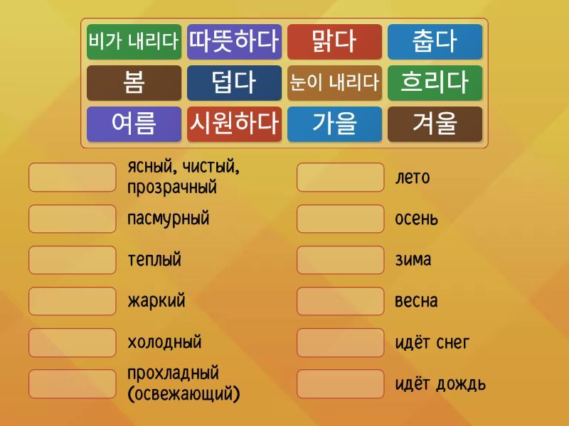 맑다  - ясный, чистый, прозрачный, 흐리다 - пасмурный, 따뜻하다 - теплый, 덥다 - жаркий, 춥다 - холодный, 시원하다 - прохладный (освежающий), 여름 - лето, 가을 - осень, 겨울 - зима, 봄 - весна, 눈이 내리다 - идёт снег, 비가 내리다 - идёт дождь,