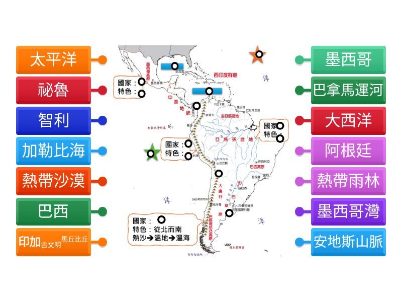 安地斯山脈, 祕魯, 印加古文明馬丘比丘, 巴西, 熱帶雨林, 智利, 墨西哥, 熱帶沙漠, 墨西哥灣, 加勒比海, 大西洋, 太平洋, 巴拿馬運河, 阿根廷.