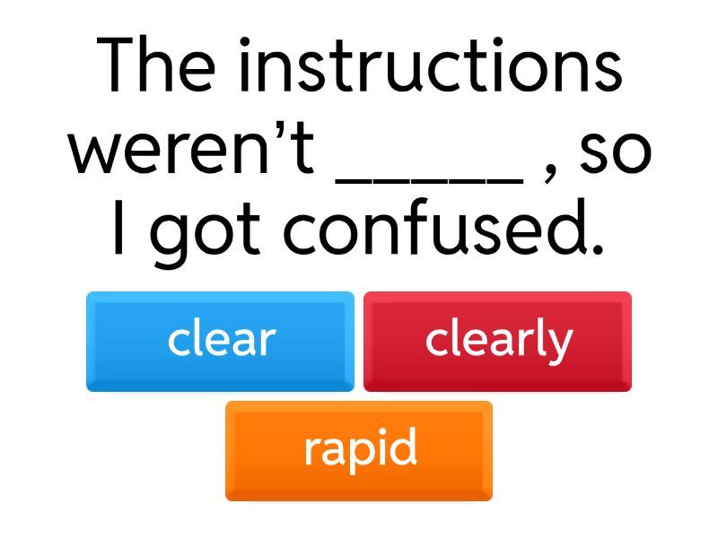 1) The instructions weren’t _____ , so I got confused. a) clear b) clearly c) rapid 2) The storm passed _____ during the night. a) rapid b) perfect c) rapidly 3) That was a _____ drawing! You’re very talented. a) perfectly b) luckily c) perfect 4) He finished the test _____ before anyone else. a) clear b) completely c) complete 5) We were very _____ to find our dog after he ran away. a) lucky b) luckily c) complete 6) She explained the homework very _____ , so everyone understood it. a) clear b) clearly c) perfect 7) It wasn’t a _____ change, but we improved slowly over time. a) rapid b) rapidly c) completely