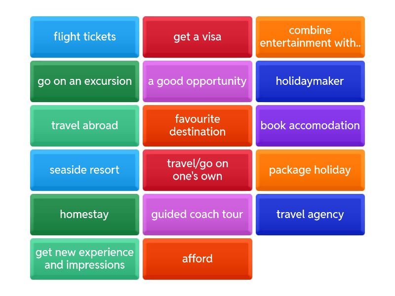 travel abroad, go on an excursion, holidaymaker, book accomodation, homestay, guided coach tour, travel/go on one's own, package holiday, seaside resort, afford, favourite destination, travel agency, a good opportunity, combine entertainment with.., get new experience and impressions, flight tickets, get a visa,