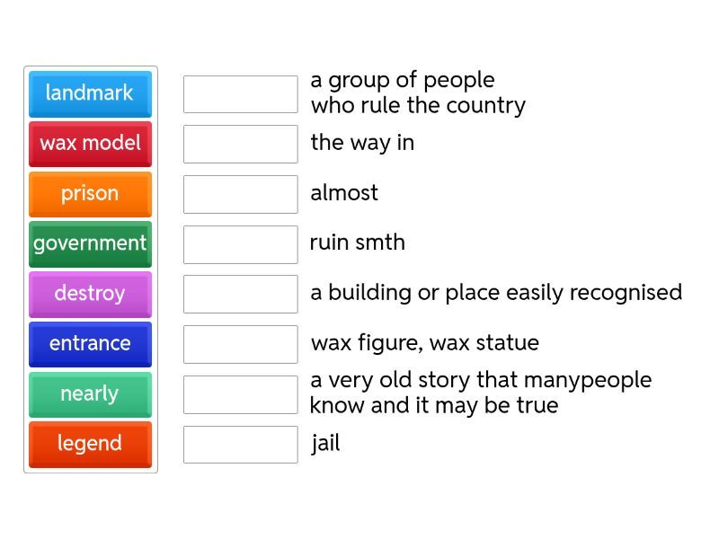 nearly - almost, prison - jail, legend - a very old story that manypeople know and it may be true, landmark - a building or place easily recognised, government - a group of people who rule the country, destroy - ruin smth, wax model - wax figure, wax statue, entrance - the way in,